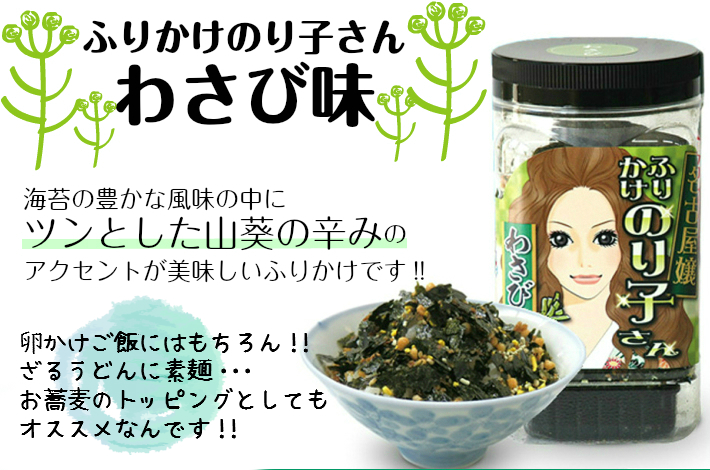 店内アウトレット商品のご案内(^_-)-☆ 2026.02.10 お知らせ海苔屋コラム 現在 店頭にあるアウトレット商品のご案内です٩( ”ω” )و味もみのりとアラレがたっぷり入っていてご飯がススム!ツーンと爽やかな辛みが鼻に突き抜ける!【ふりかけのり子さん ワサビ味】※2枚目の写真は旧ボトルです。通常価格が税込み756円のところ…賞味期限が2026年2月末のため 税込み378円にて販売中!(^^♪『食べたことないけど味が気になるなあ~』と思っていたソコのあなた!この機会にお味見がてらいかがでしょう?フードロス削減にご協力くださいm(__)m