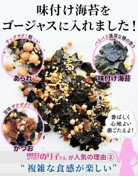 | 原材料名 | 干海苔(国内産)あられ、乳糖、胡麻、砂糖、食塩、鰹、澱粉、醤油、ブドウ糖、全卵粉末、デキストリン、抹茶粉末、昆布粉末、調味料(アミノ酸等)、着色料(ビタミンB2、クチナ、アナトー、ベニバナ) ※原材料の一部に卵、乳、小麦、大豆、米を含む |
